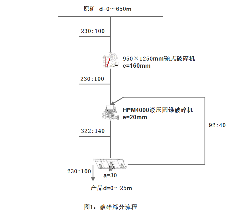 (1)顎式破碎機的破碎比S1:顎式破碎機產(chǎn)品最大粒度為d大=200mm,其第一段破碎比為S1=3.25。其破碎比范圍符合3-6的理論要求。